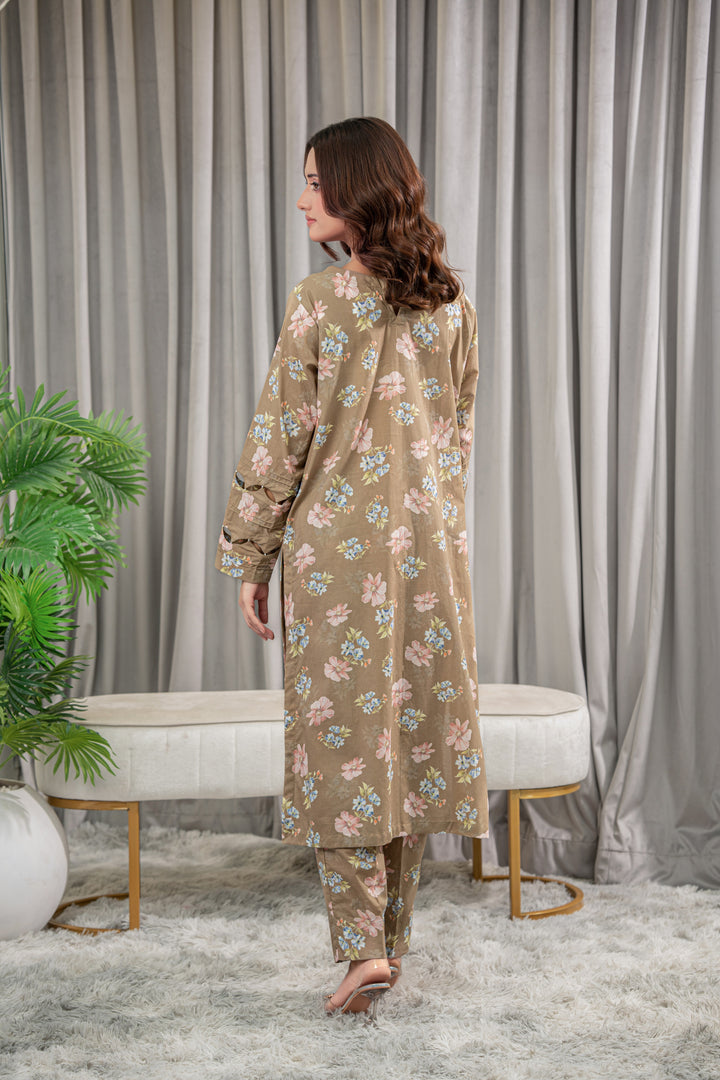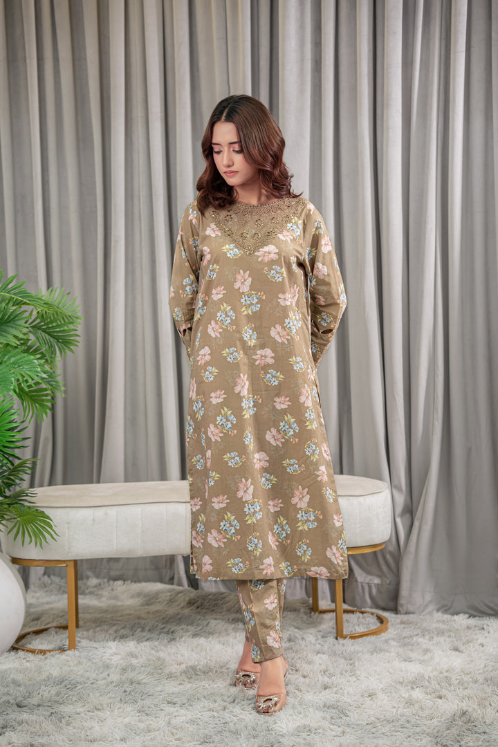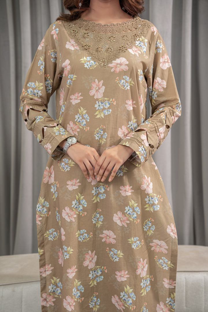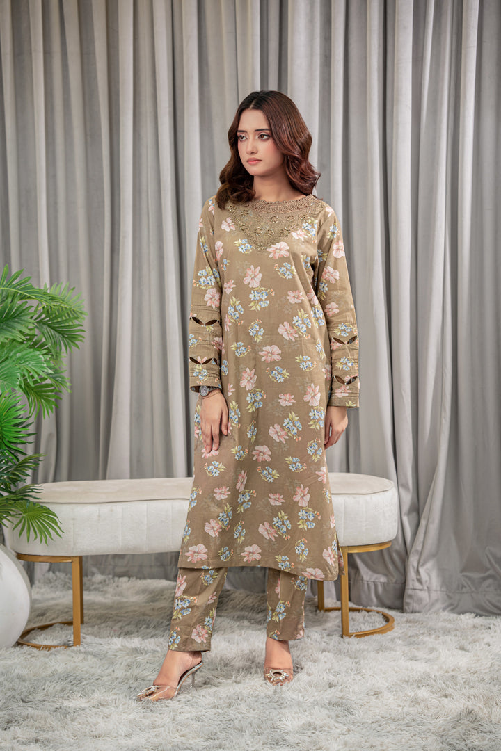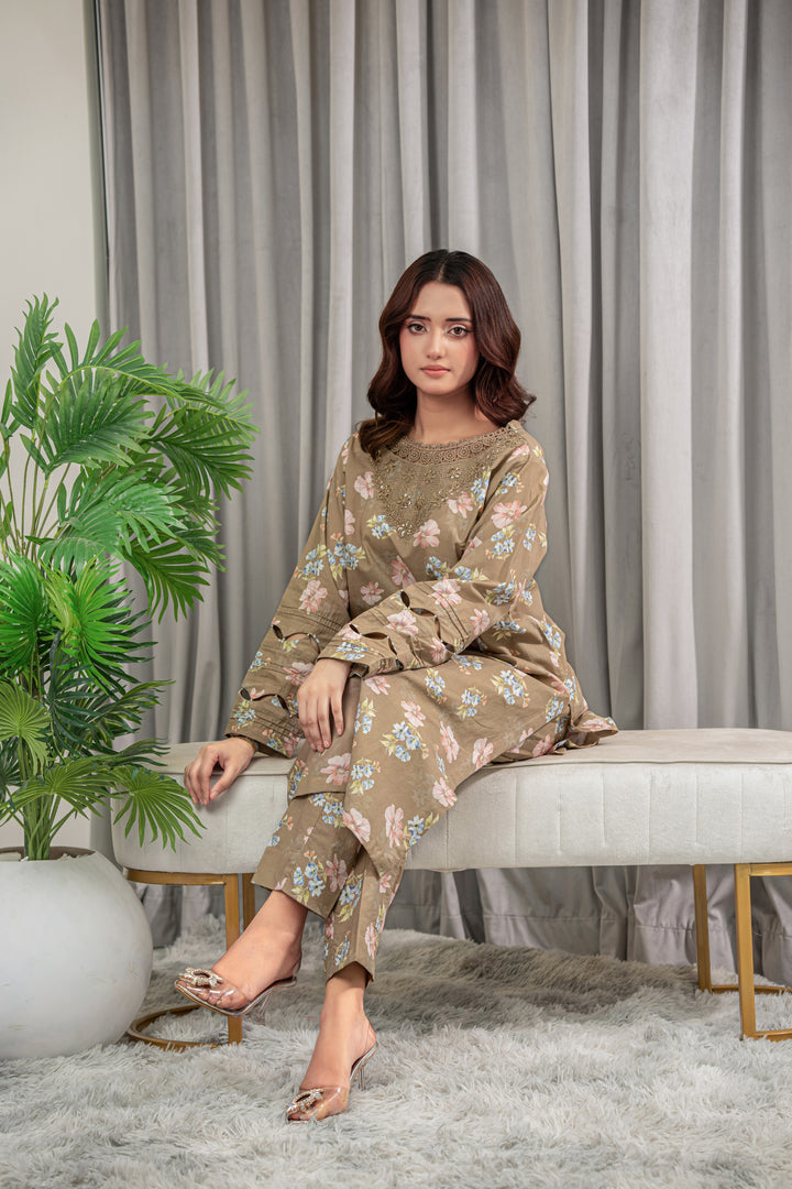 A soft beige lawn 2-piece adorned with delicate pink and blue floral prints. The shirt features elegant cutwork sleeves and subtle embroidery on the neckline, paired with matching straight trousers