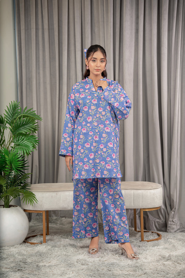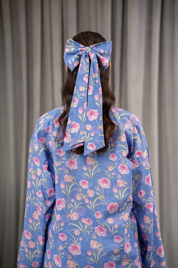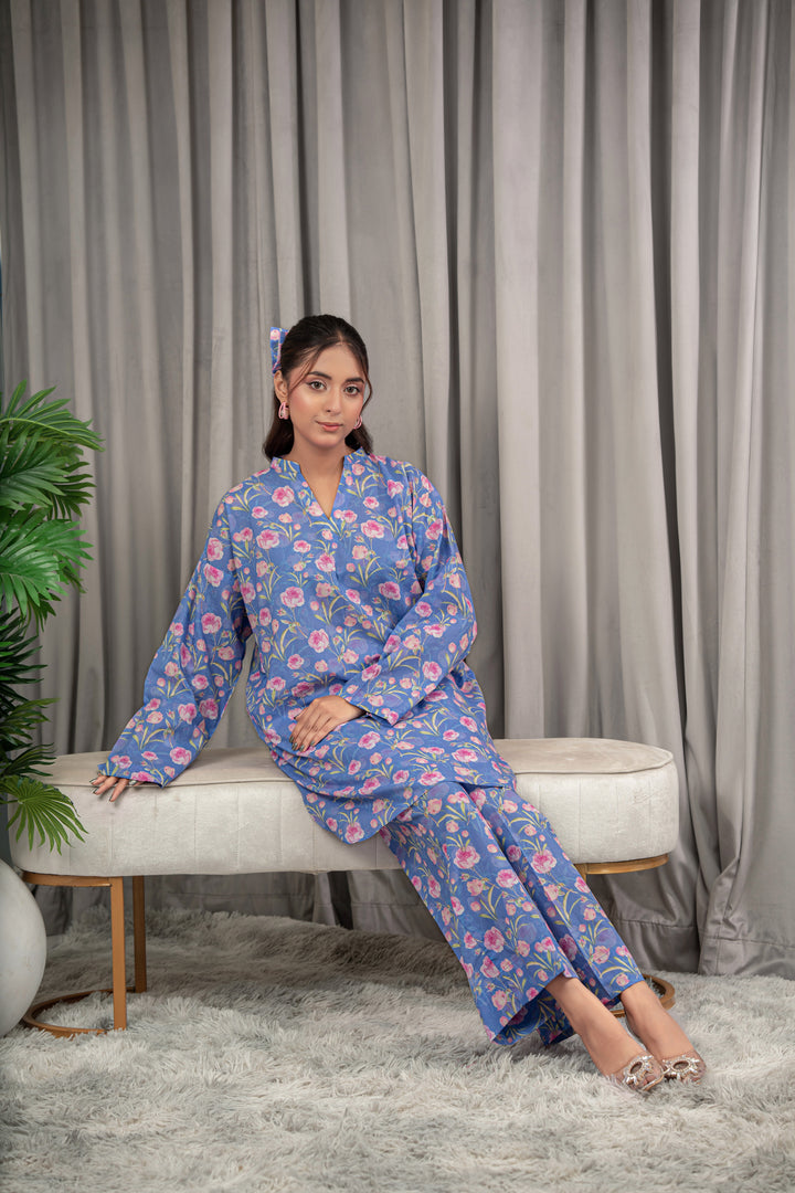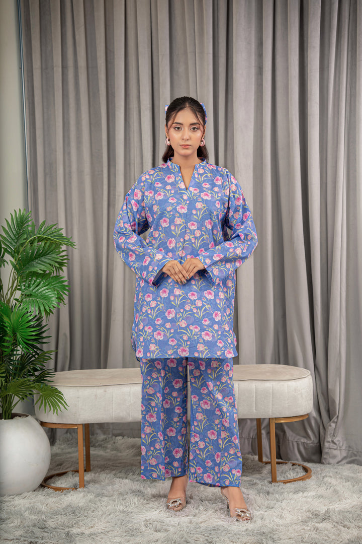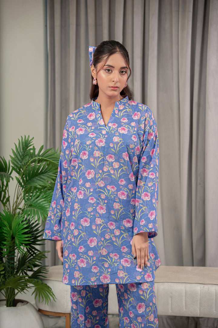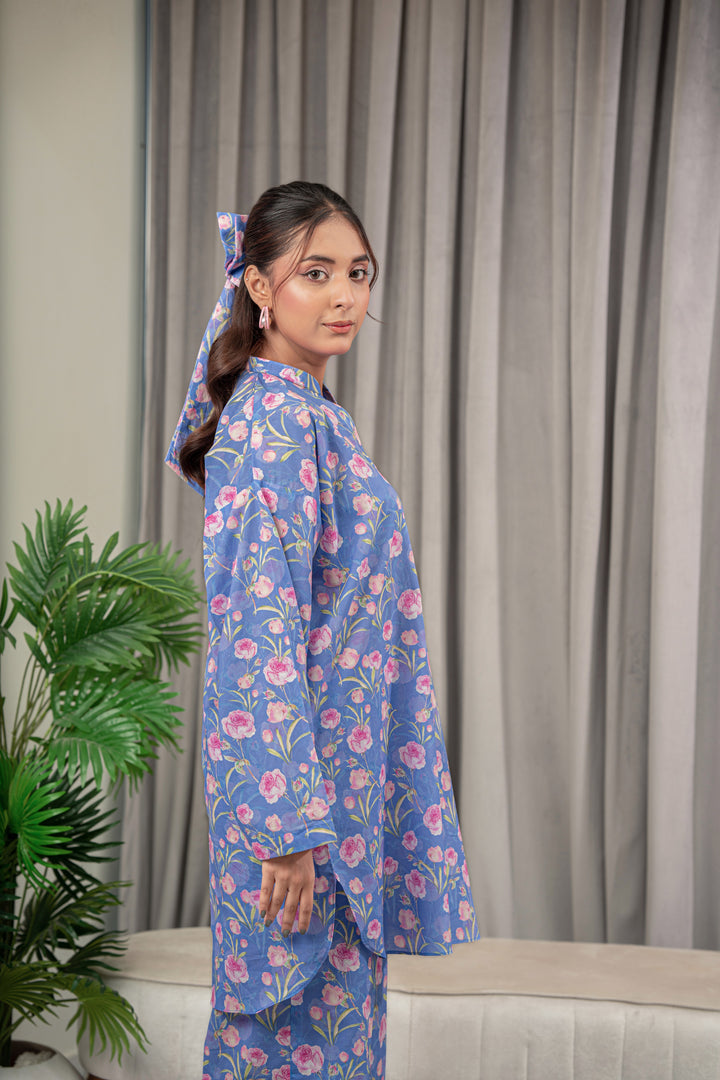A refreshing blue lawn 2-piece featuring a vibrant floral print in pink and lilac tones. The straight-cut shirt with a sleek neckline is paired with wide-leg trousers for a chic and effortless everyday look