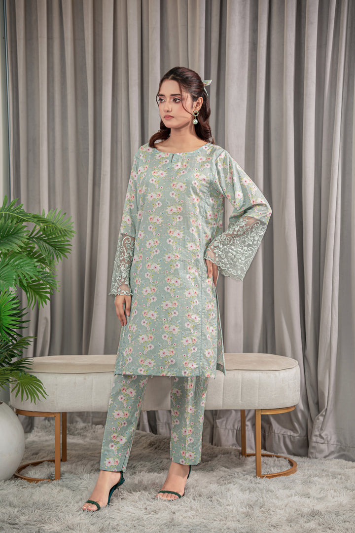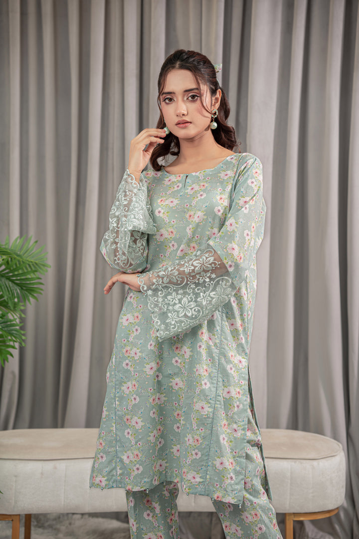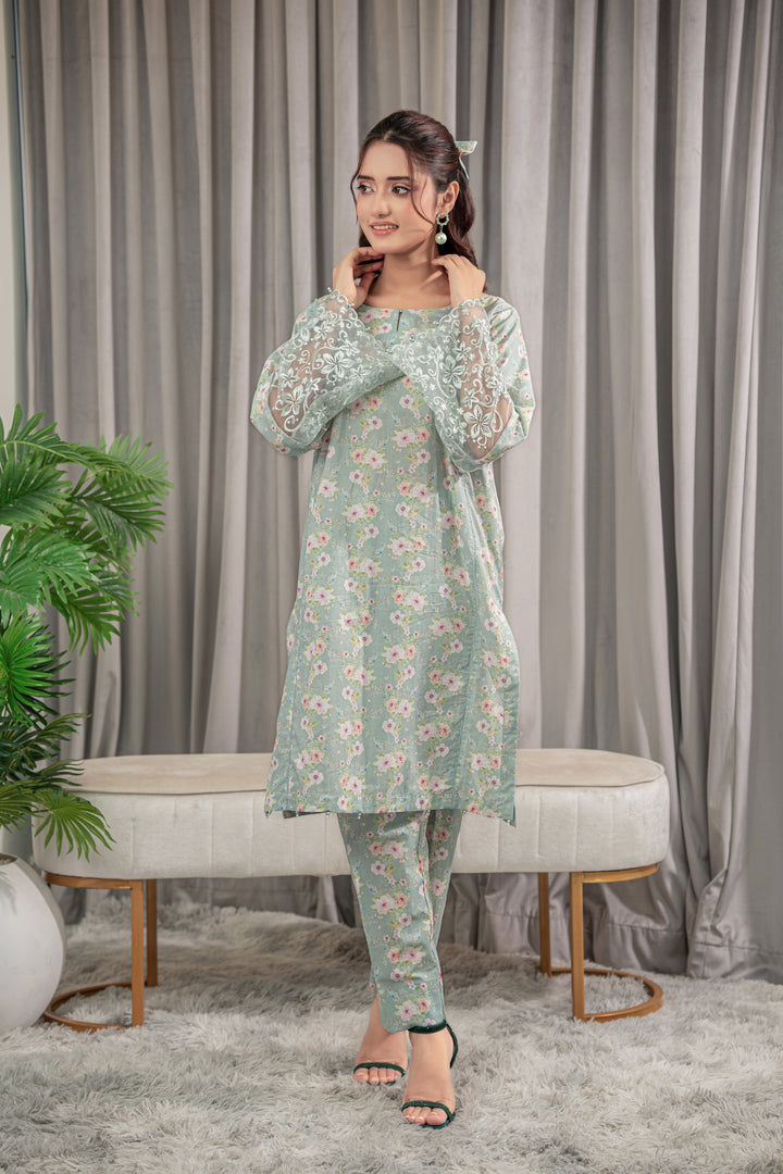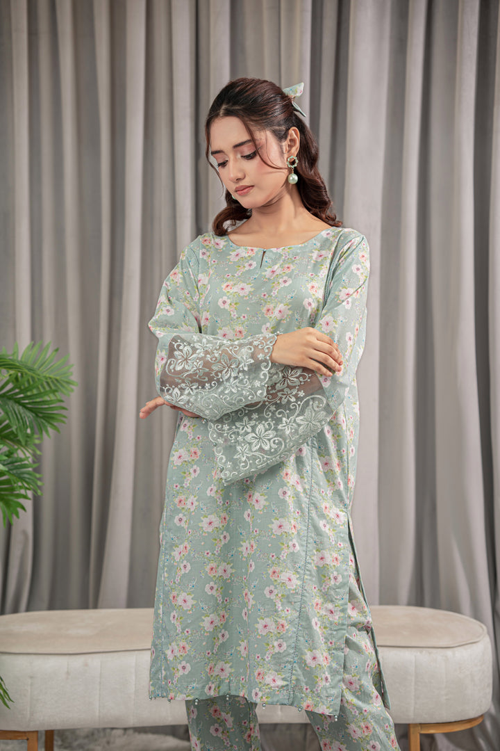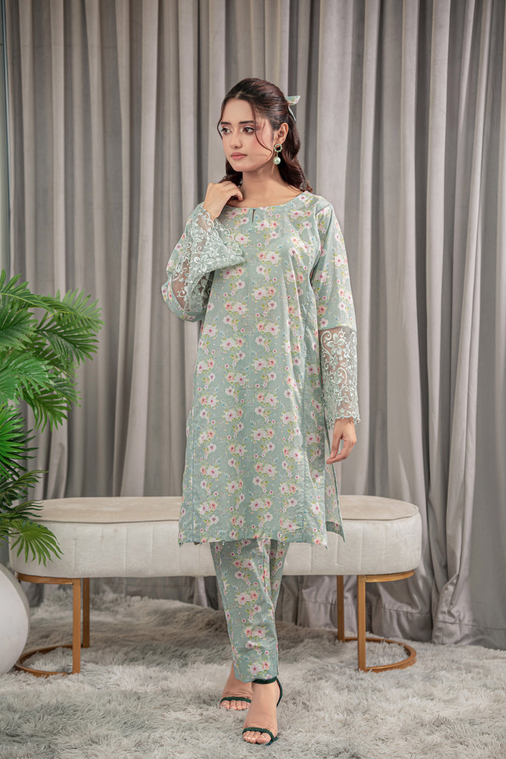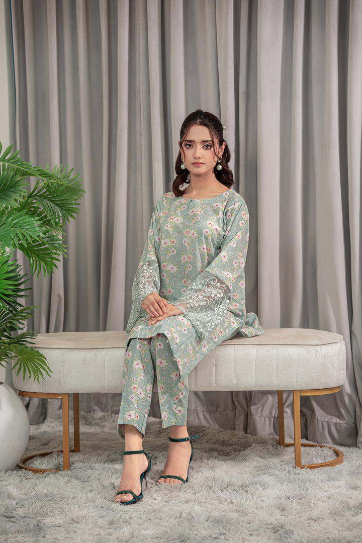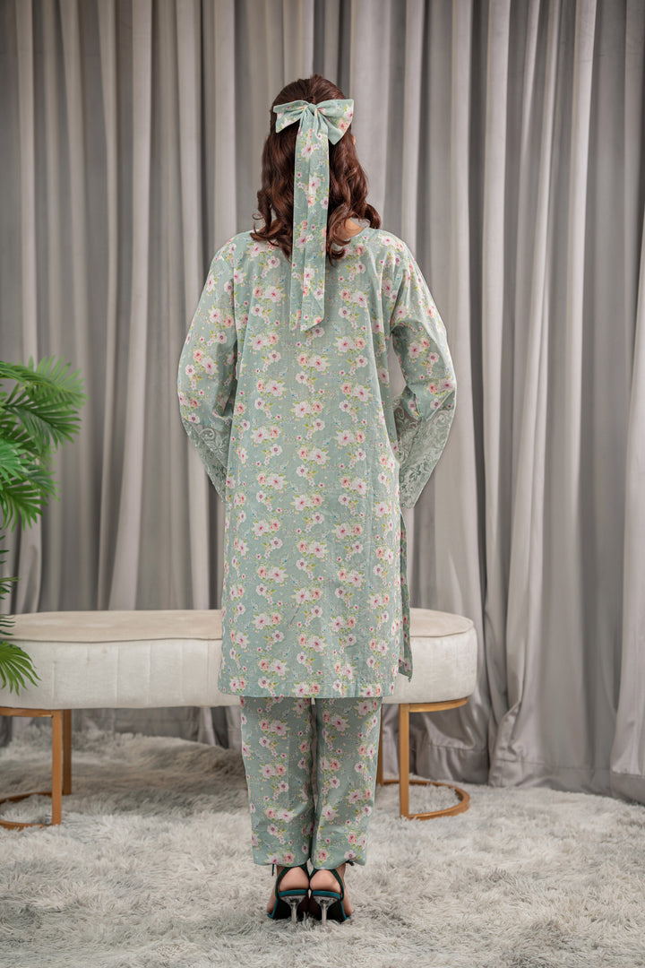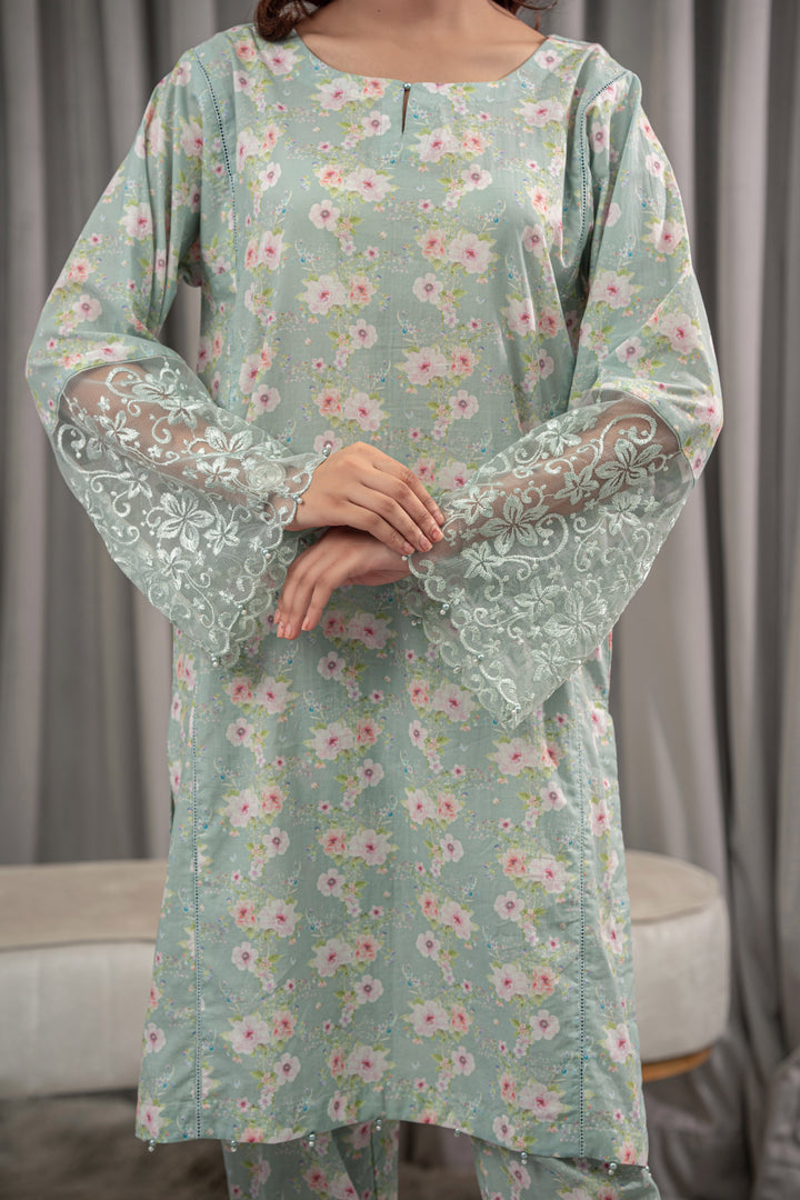 A refreshing mint green lawn 2-piece adorned with delicate floral prints in pink and white. The straight-cut Kurta features embroidered lace sleeves, paired with matching straight pant.