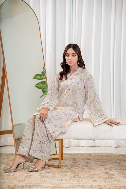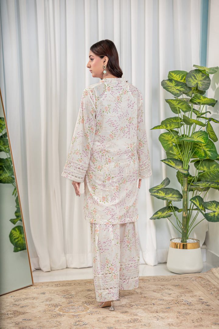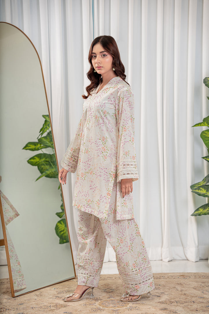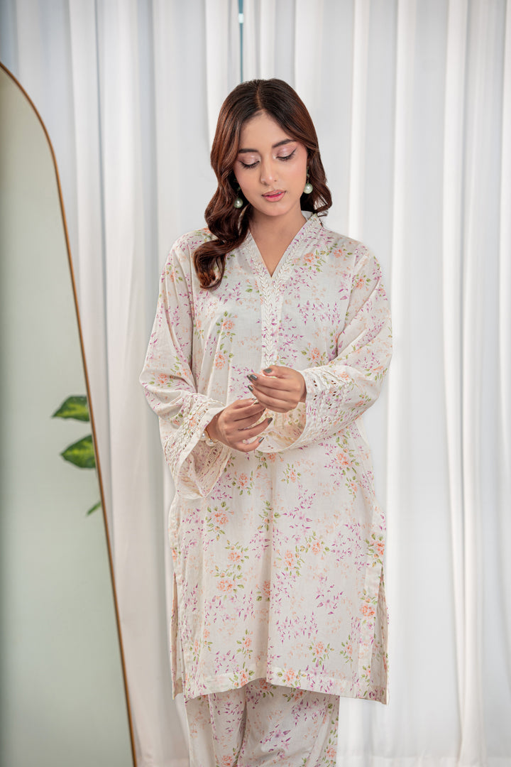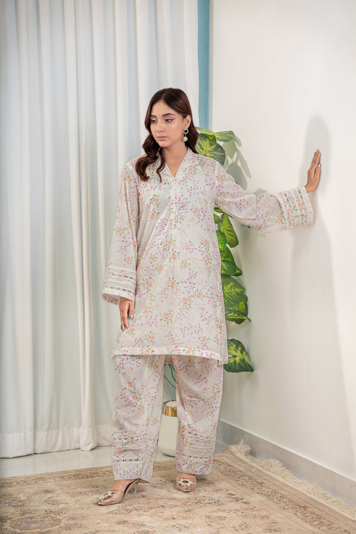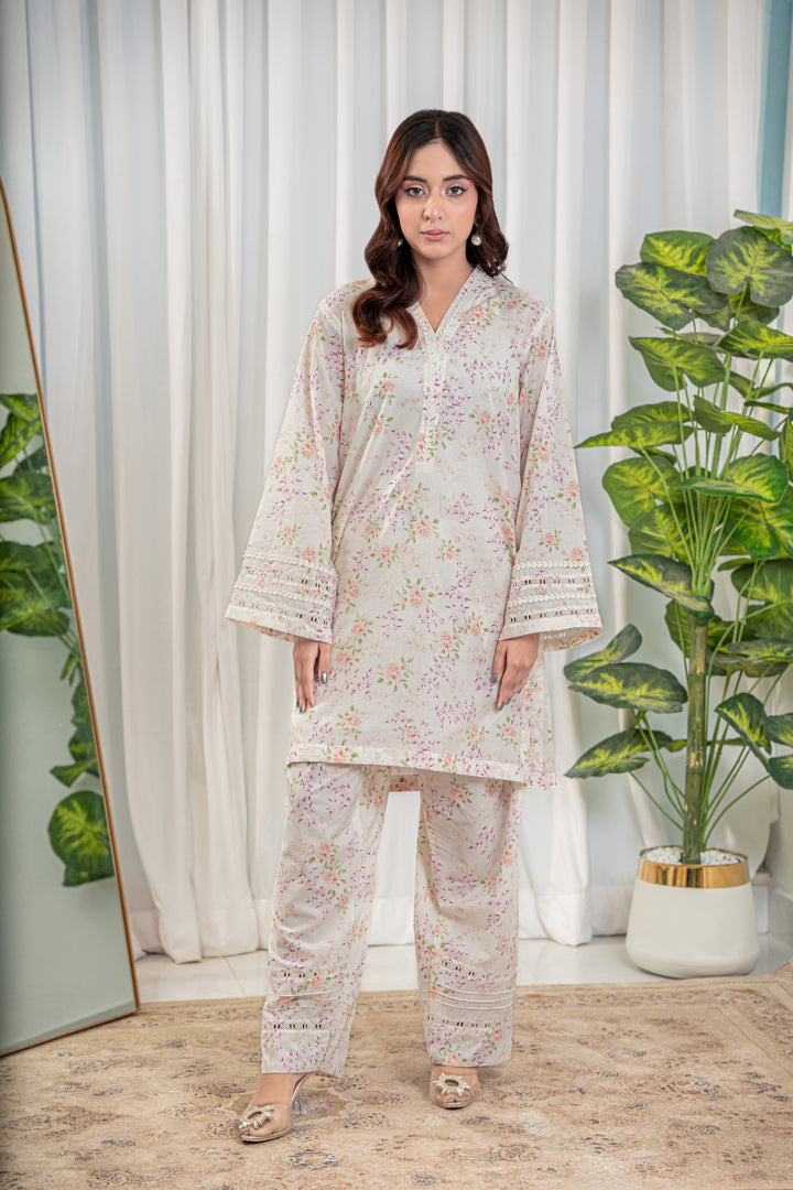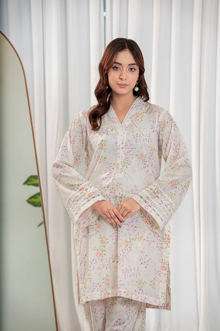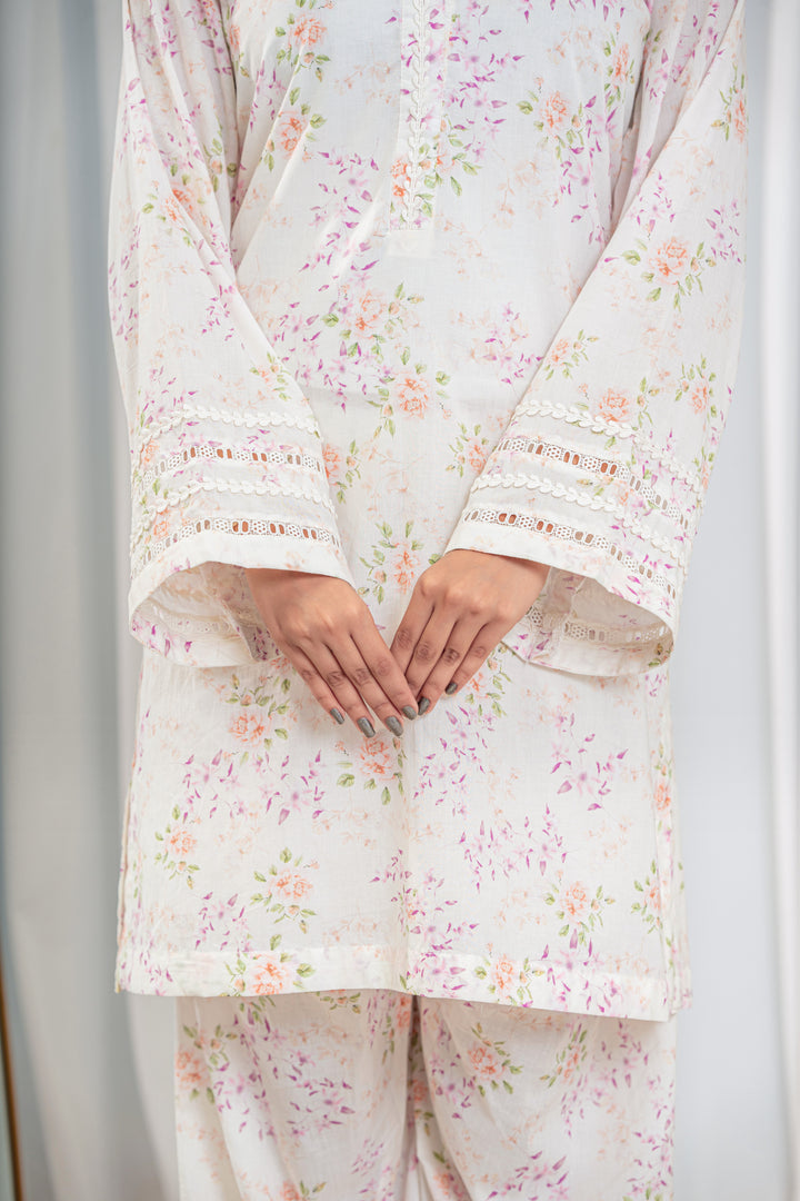 An elegant off-white lawn 2-piece set adorned with soft floral prints in pastel hues. The shirt features a straight cut with delicate lace and pleated detailing on the sleeves, paired with matching Shalwar enhanced with lace.