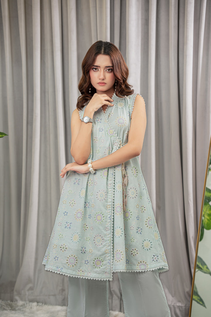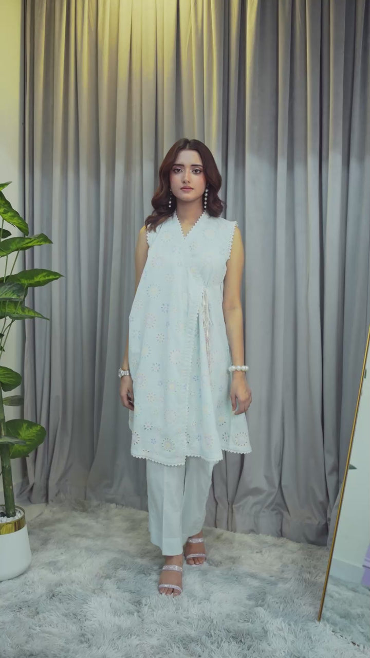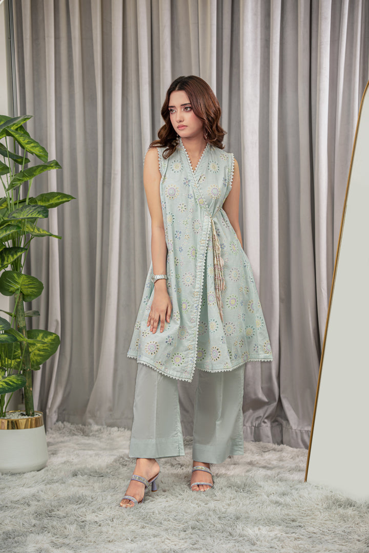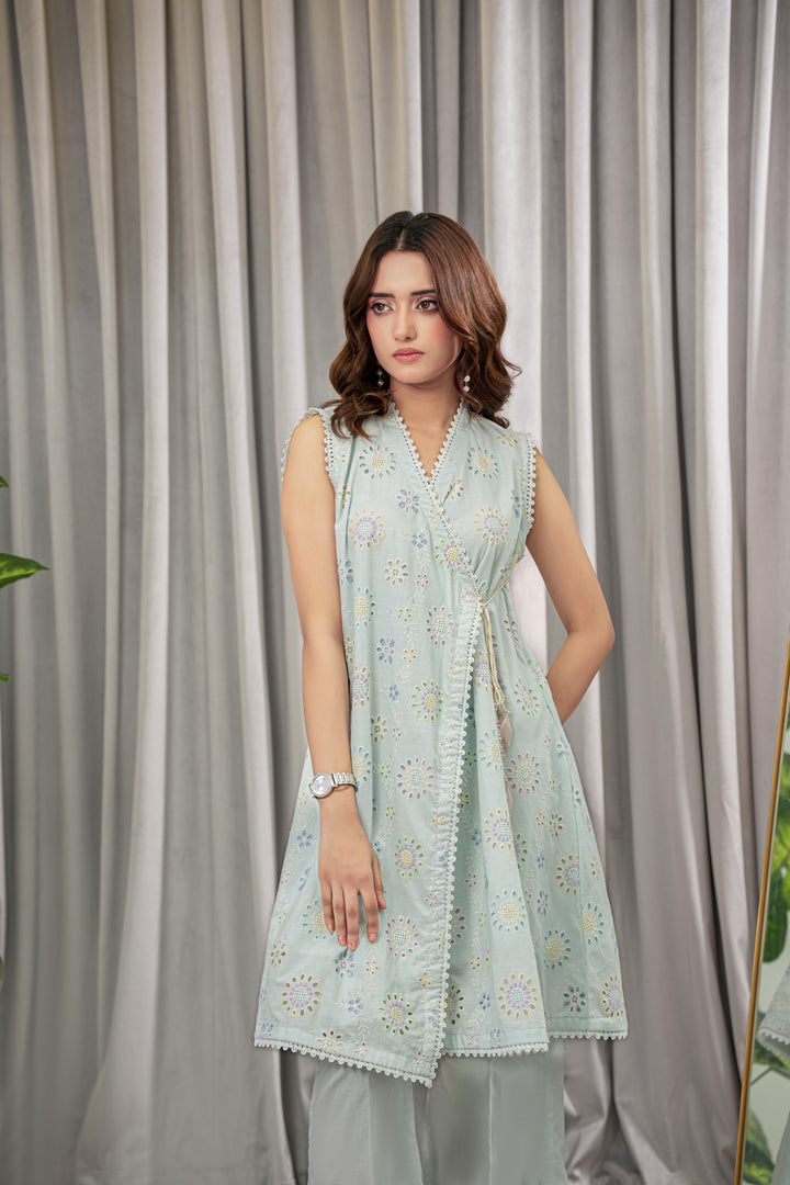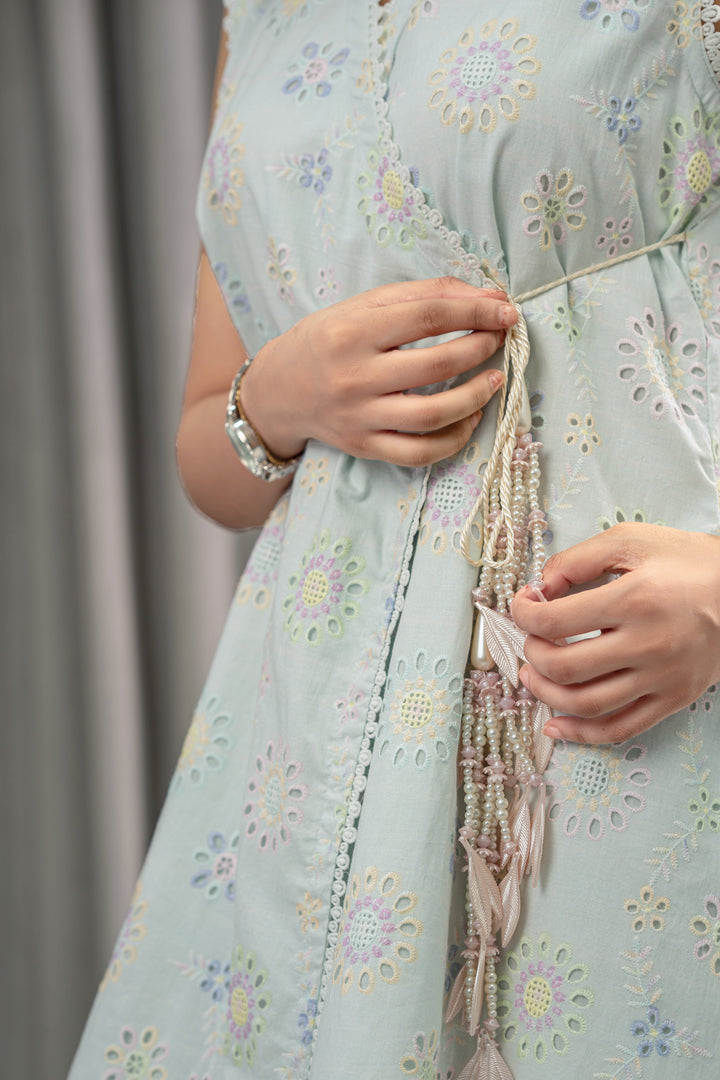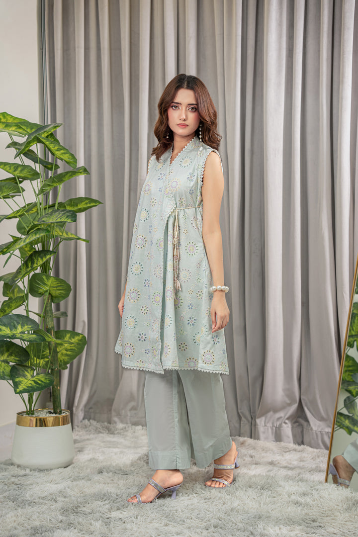 A chic sky blue intermix lawn 2-piece set adorned with delicate floral embroidery throughout the shirt. The sleeveless kurta features a V-neckline, lace-trimmed edges, and tassel detailing for added elegance. Paired with matching straight trousers